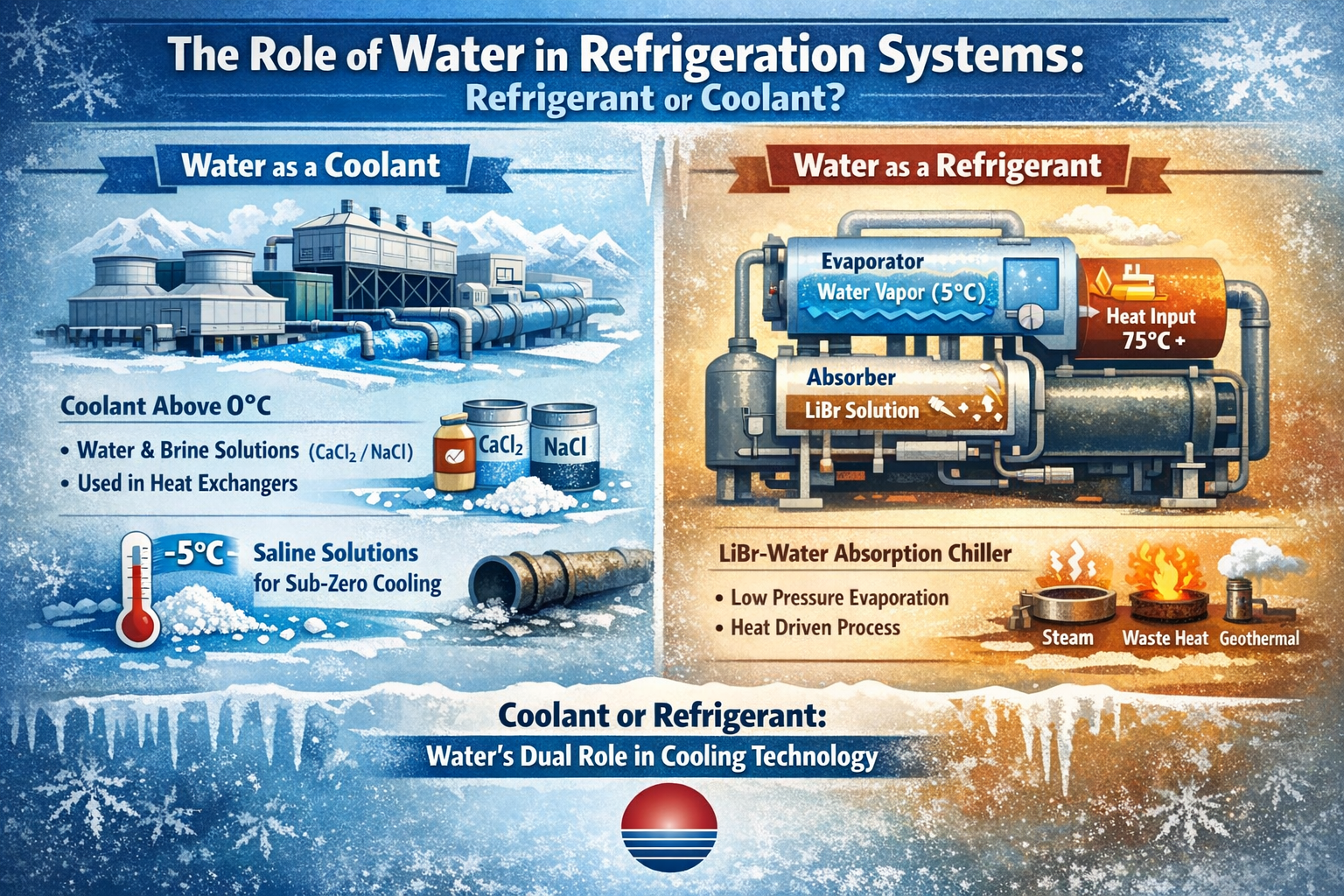 Water can also function as a refrigerant, notably in absorption refrigeration systems such as those using lithium bromide (LiBr)-water as the working fluid pair. Similar to vapor-compression refrigeration, absorption systems rely on the evaporation of a liquid refrigerant at low pressure and temperature to absorb heat from a coolant (typically chilled water). The key distinction lies in the use of a binary working fluid—here, the LiBr-water solution—where water acts as the refrigerant.