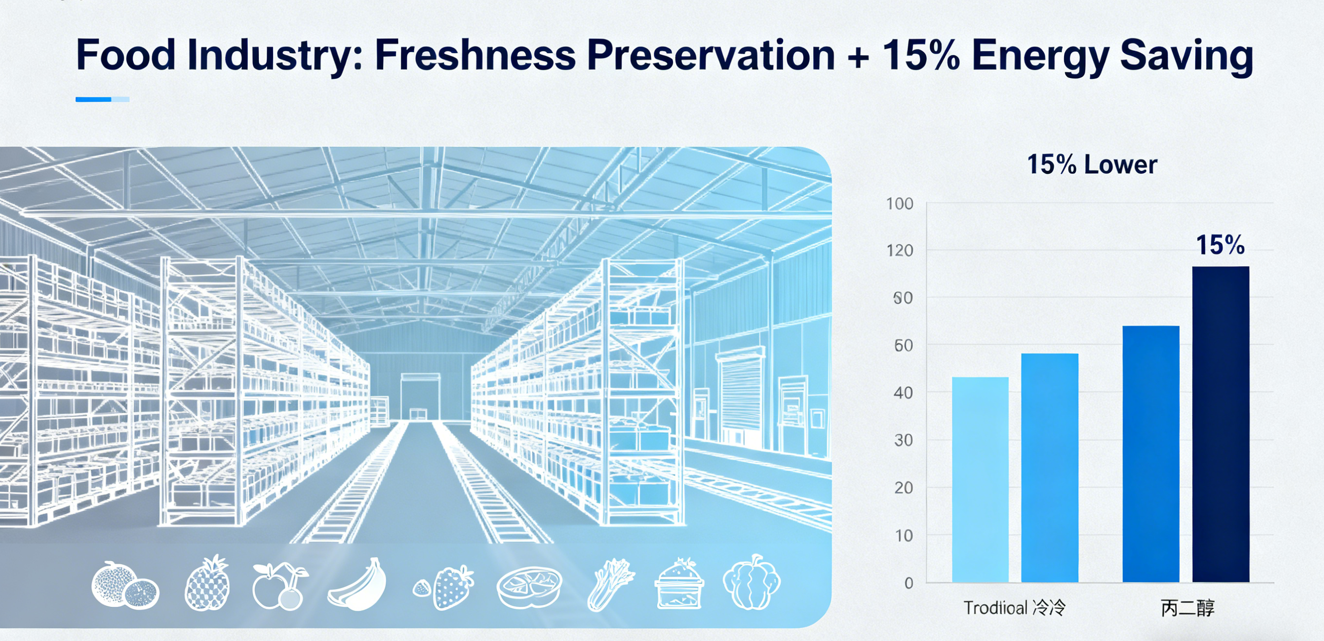 In the food processing and transportation industry, Glacier Group's propylene glycol refrigerant is a powerful assistant in the cold chain transportation link. Large-scale cold chain logistics centers generally use propylene glycol aqueous solution as a coolant. It can not only effectively maintain a low-temperature environment to ensure food freshness but also significantly reduce energy consumption. Statistics show that the average energy consumption of refrigeration systems using propylene glycol as a refrigerant is approximately 15% lower than that of traditional systems.
